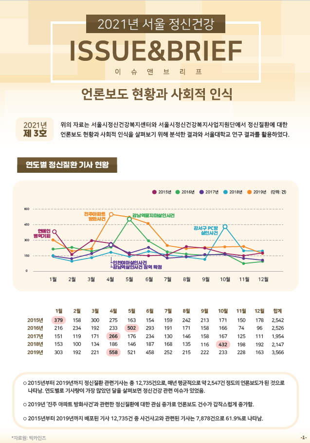 본 자료는 서울시정신건강복지사업지원단에서 정신질환에 대한 언론보도 현황과 사회적 인식을 살펴보기 위해 분석한 결과와 서울대학교 연구 결과를 활용하였습니다.